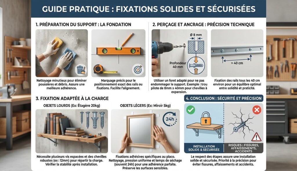 Avant toute fixation, la préparation du support est impérative : la surface doit être propre et régulière. Un nettoyage minutieux élimine poussières et débris, assurant une meilleure adhérence des fixations. Un marquage précis facilite le positionnement exact du rail. Le perçage demande rigueur. Il faut utiliser un foret de taille adaptée pour ne pas endommager le support. Par exemple, pour des chevilles à expansion, un trou pilote de 8 mm de diamètre et 40 mm de profondeur assure un bon ancrage. La fixation des rails s’effectue tous les 40 cm environ, équilibre entre solidité et praticité.